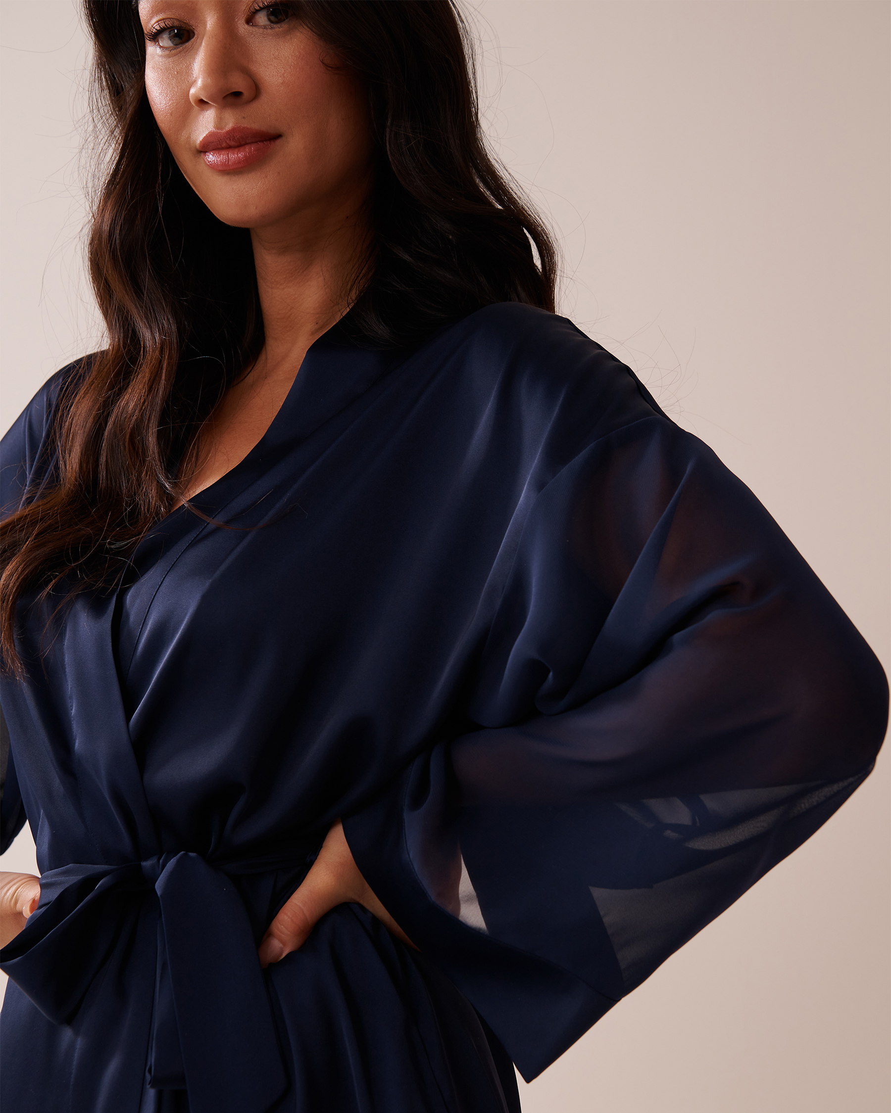 Every detail in this satin kimono, from the sheer chiffon inserts to the flowing, light design, exudes elegance.