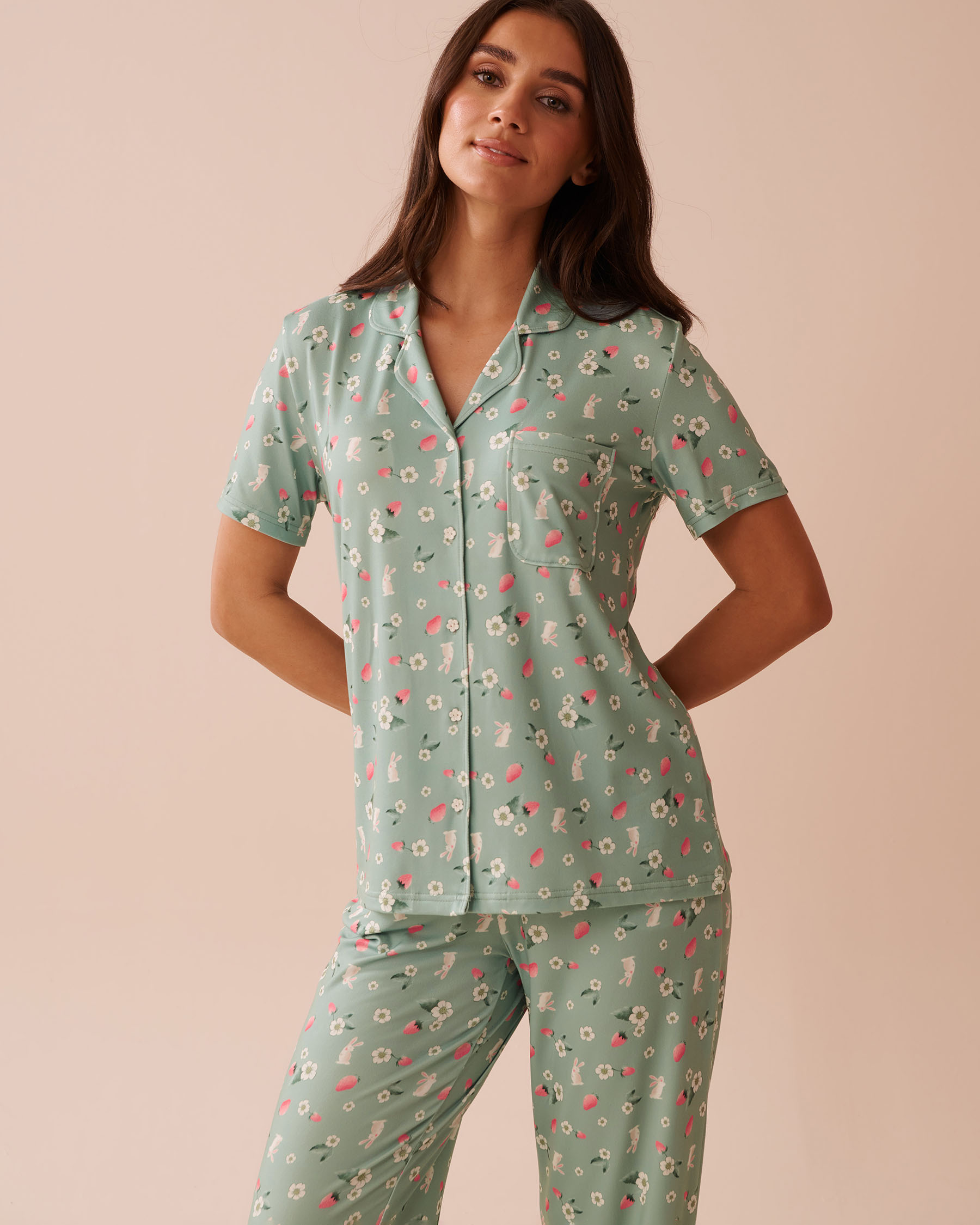 Cuddly bunny print on our super soft peachy dream fabric? Yes, please! This flowy pajama top is perfect for those lazy, sunny days ahead.