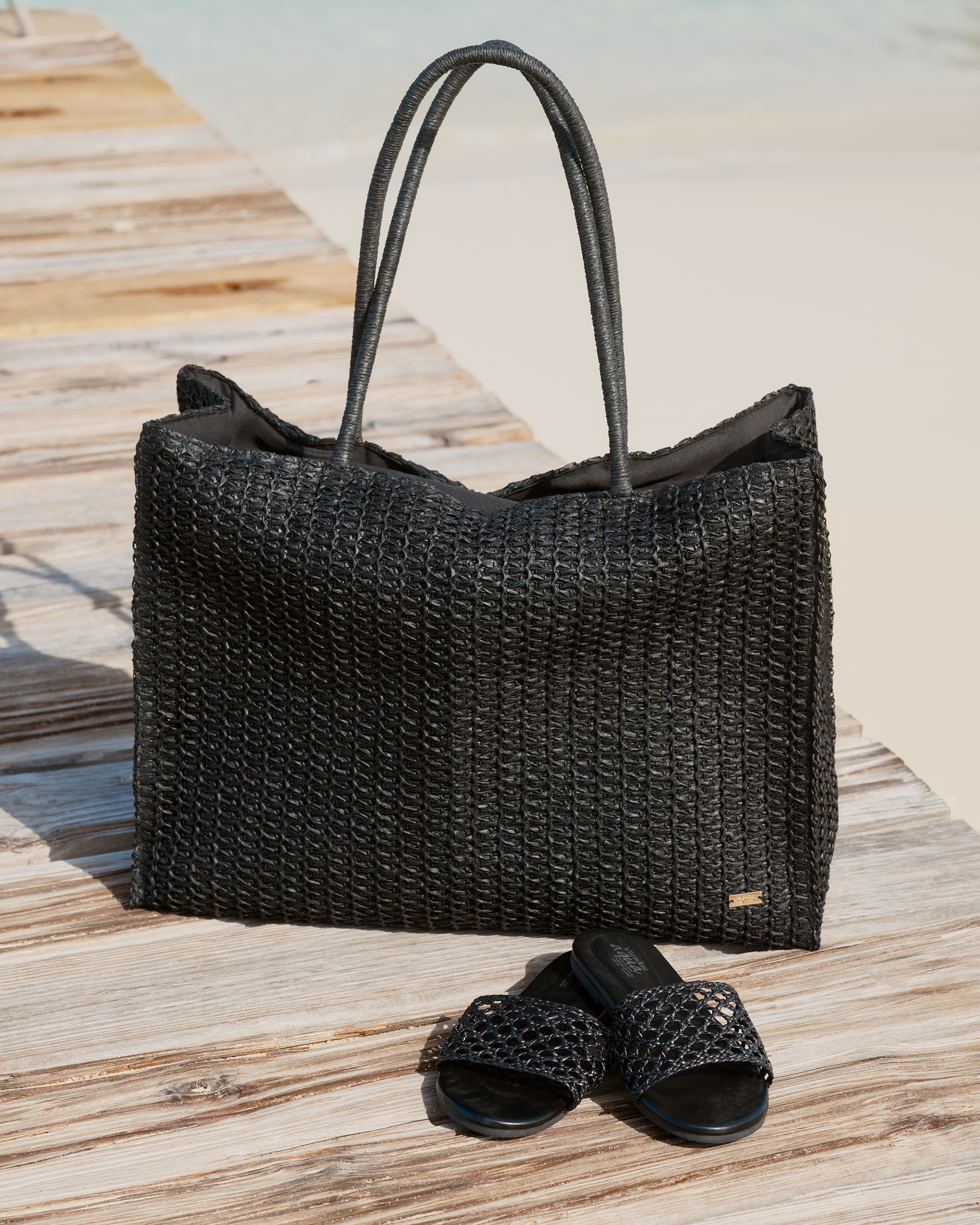 A straw bag made for travel and taking to the beach or pool. It’s big enough to hold a towel, hat, book, and all your essentials.
