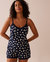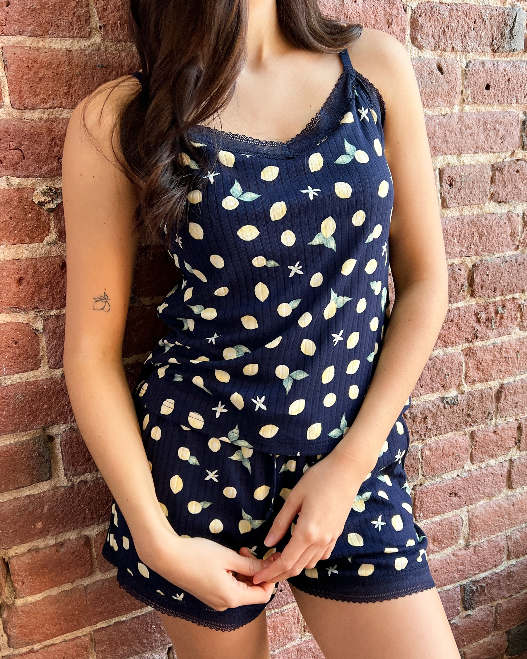 La classique camisole de pyjama rehaussée d'un léger tissu côtelé, d'une bordure fine en dentelle et d'un imprimé citron pour un zeste de fantaisie. Associée à l'un de nos bas assortis, elle forme un ensemble fluide parfait pour les temps plus chauds.