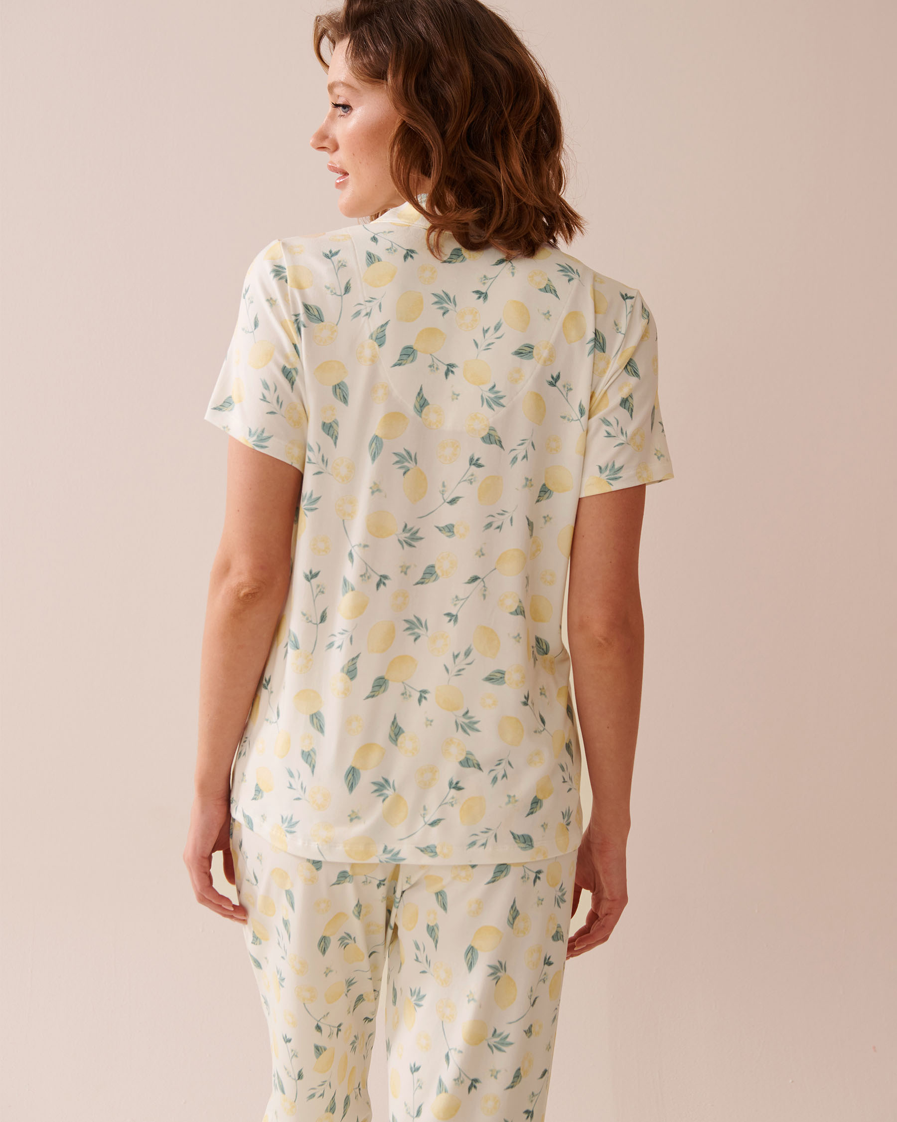 Notre tissu peau de pêche se pare d'un joli imprimé acidulé. Avec son incroyable douceur et sa coupe fluide, ce haut de pyjama vous fera rêver durant les périodes plus ensoleillées.