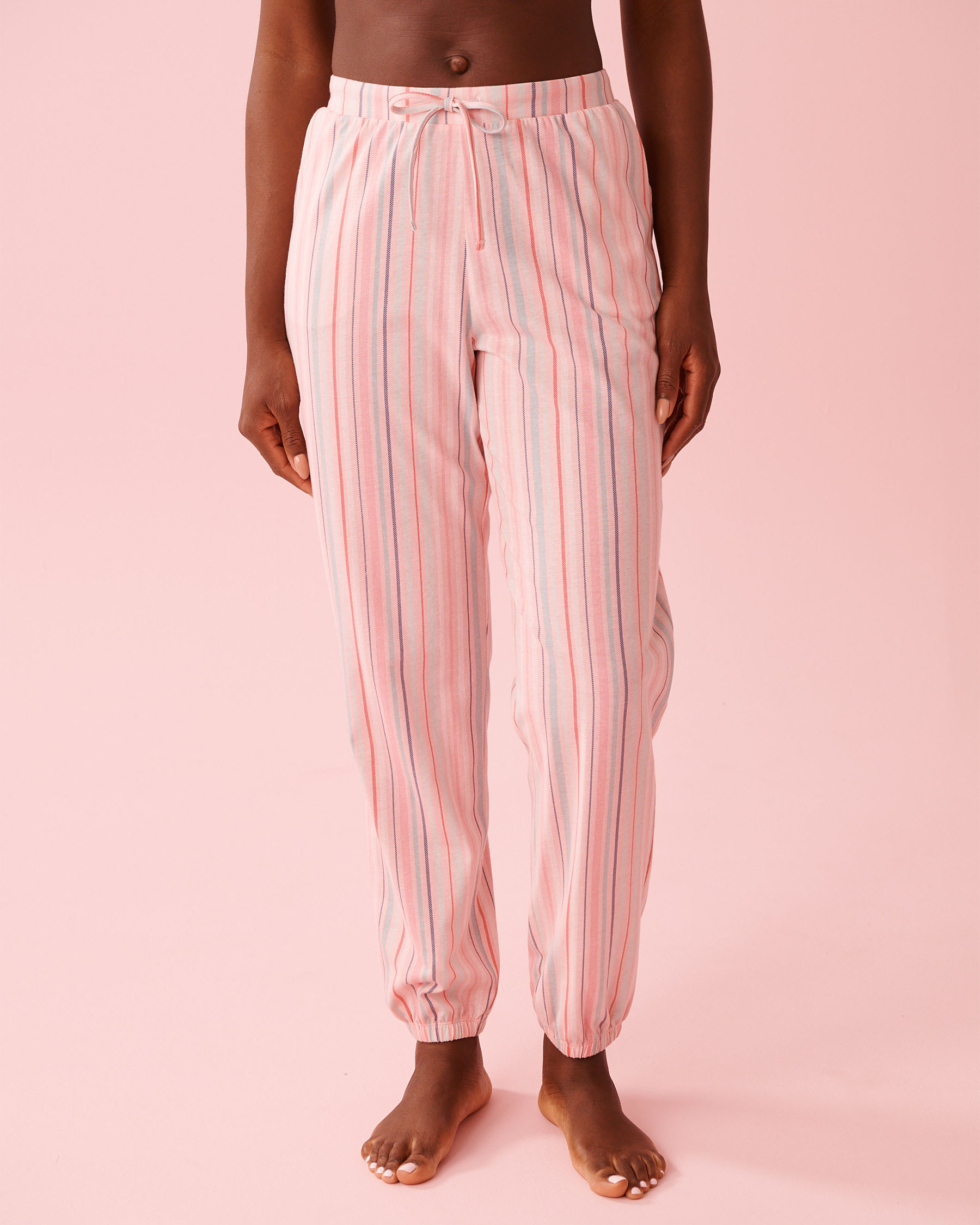 Un pantalon qui invite déjà à rêver du printemps. Ses rayures roses tendres réveillent la joie des beaux jours. À porter seul ou avec un de nos hauts assortis.