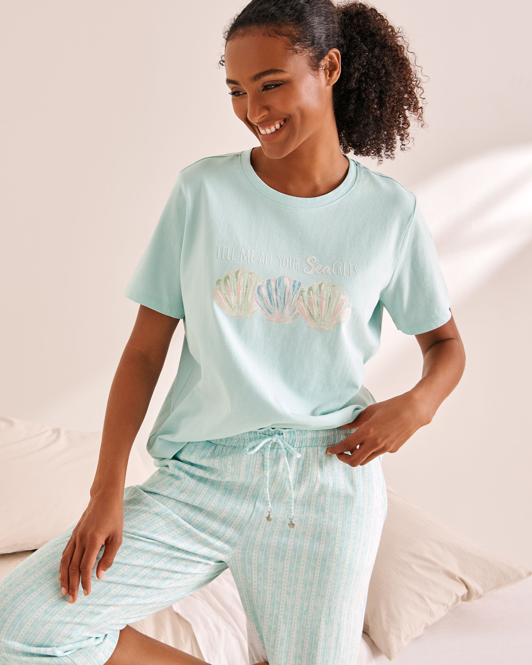 Un coton doux, respirant et des couleurs douces : ce t-shirt 100% coton est là pour vous accompagner lors de vos nuits d'été. Associez-le à nos bas de pyjama assortis!