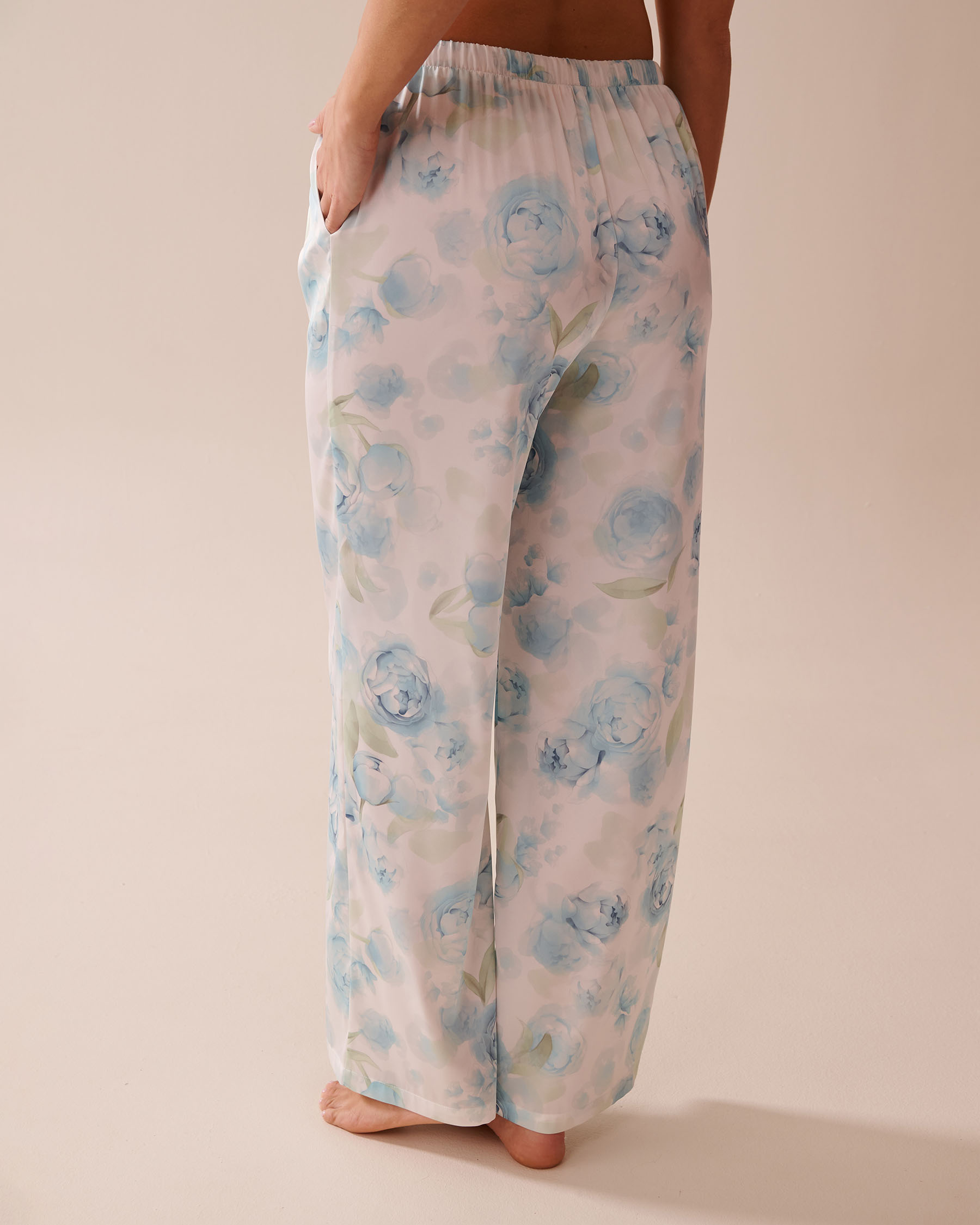 Satin meets serenity. A watercolor bloom of blue roses gives these pants a refined, seasonal charm.
