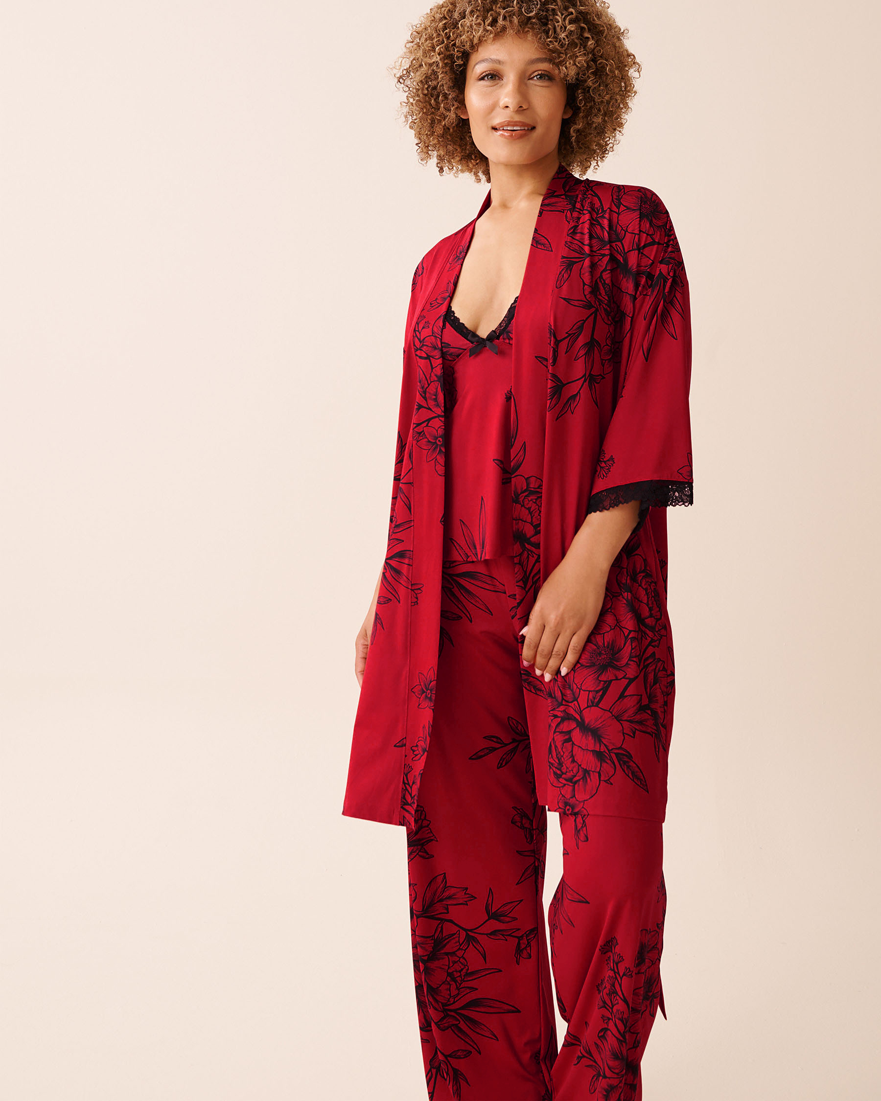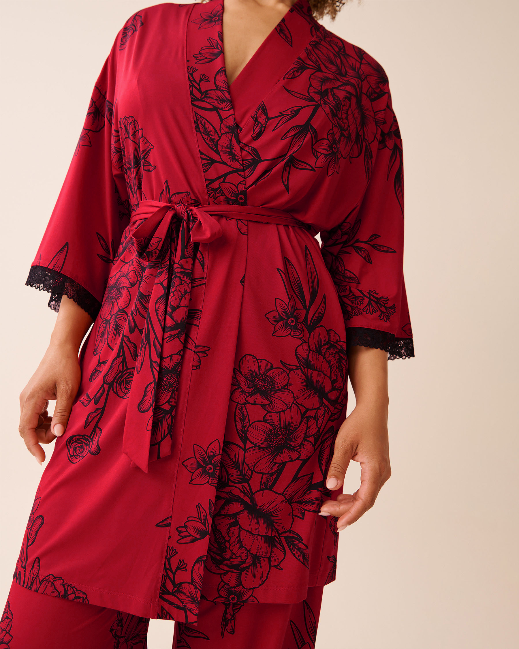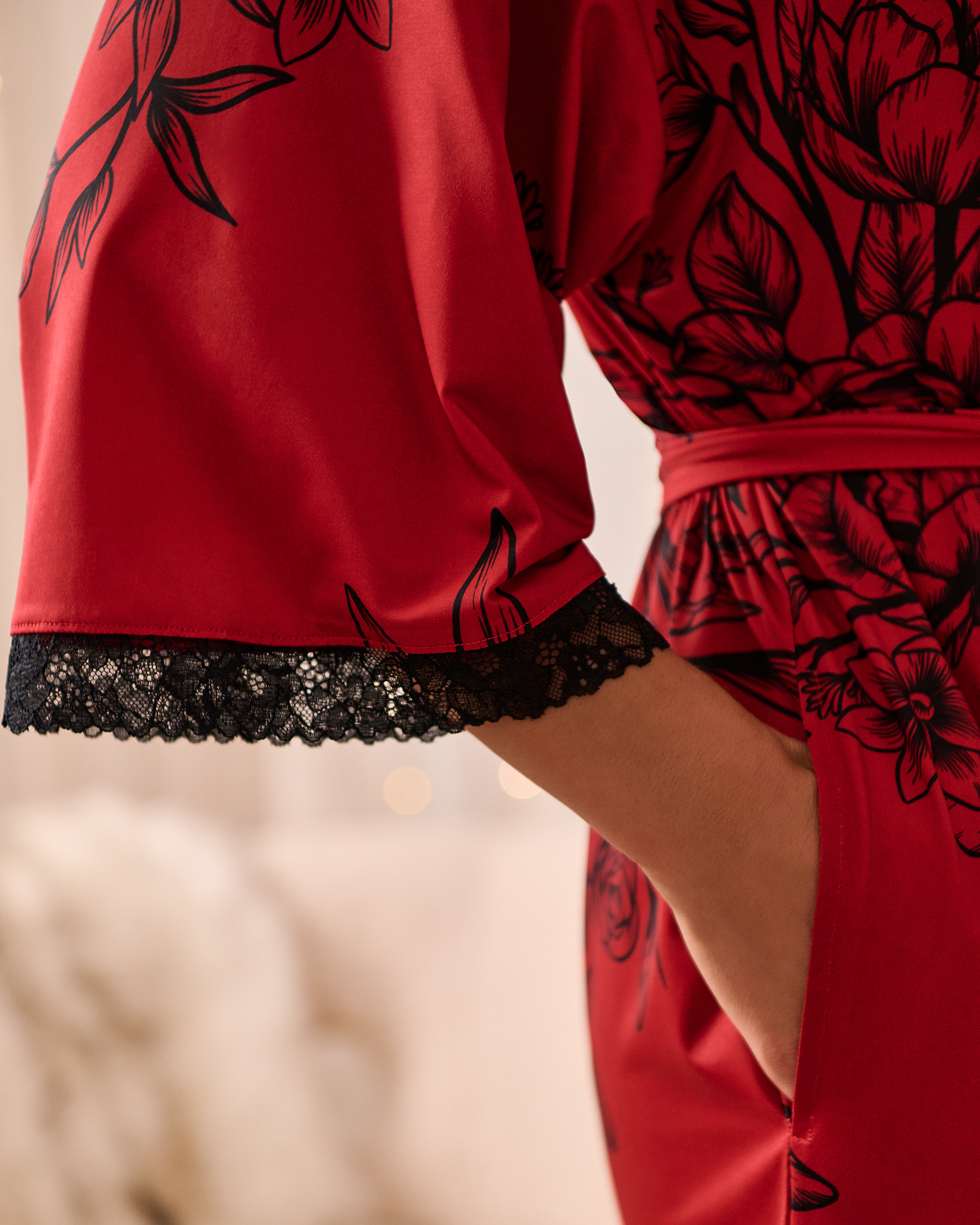 Darkly poetic blooms and touches of lace, this kimono brings a refined edge to simple moments.