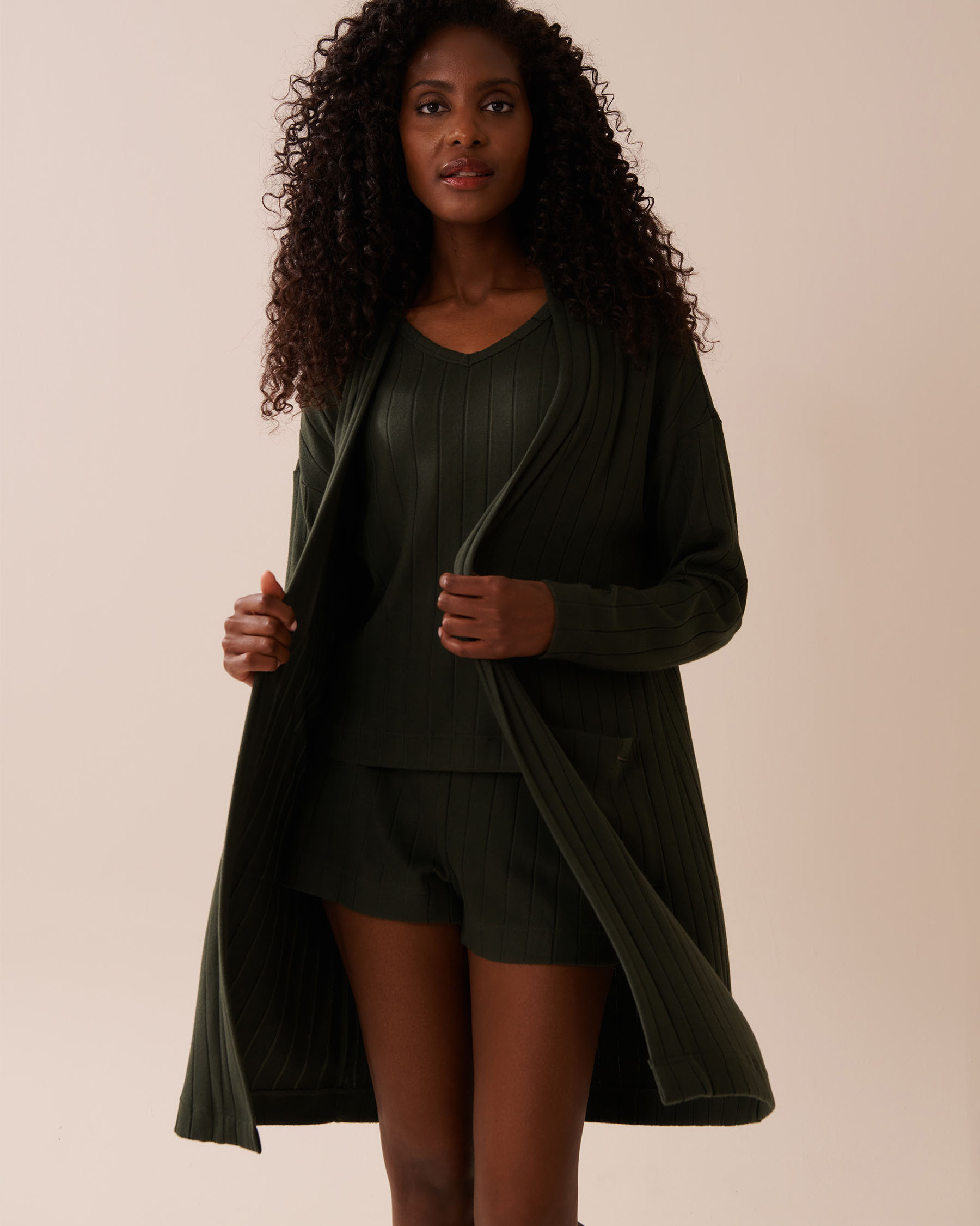 This soft-ribbed cardigan begs you to slow down and relax. But don't let its laid-back feel fool you – its refined, effortlessly stylish design will make you want to wear it far beyond your sofa.